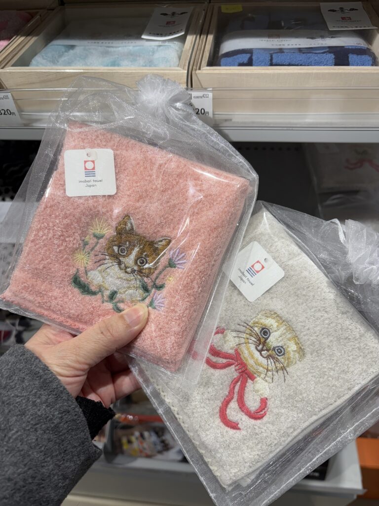 今治タオルハンカチのテキスタイル刺繍の猫イラストを担当しました。