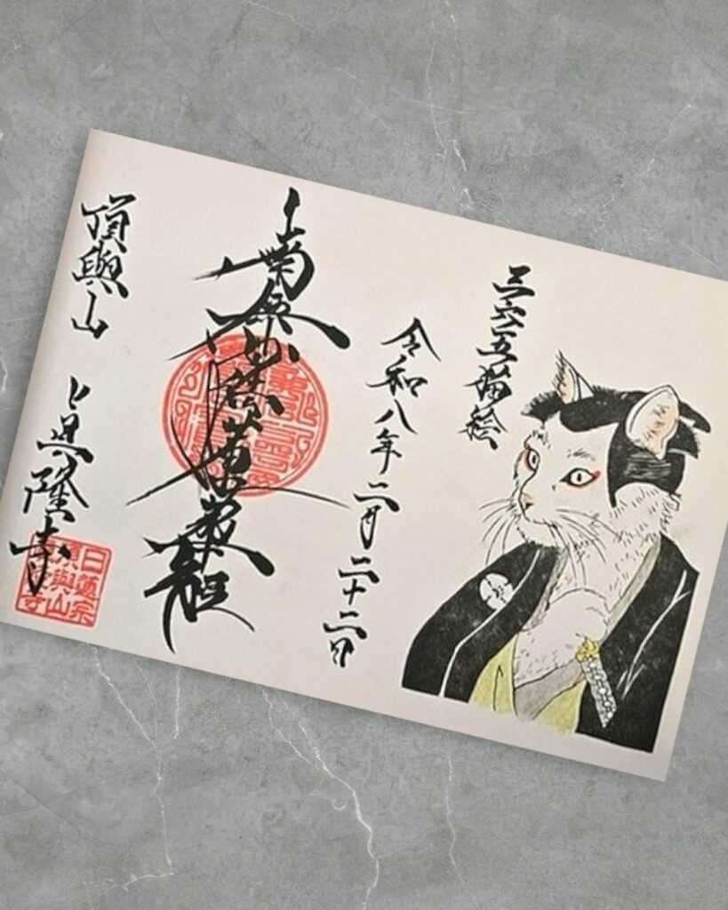 浮世絵猫シリーズの東洲斎写楽「二世市川高麗蔵の志賀大七」の浮世絵作品を猫したイラスト(三六五猫絵シリーズ)が千葉県松戸市にある頂與山 眞隆寺さまの御朱印のイラストに採用いただきました。