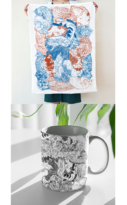 365cat.artのショップにてオリジナル猫マグカップとタオルブランケットが販売開始。ART BOOK "ANIMAL2020"で掲載されたイラスト【つながり/CONNECTION】シリーズでの展開です。